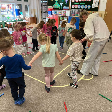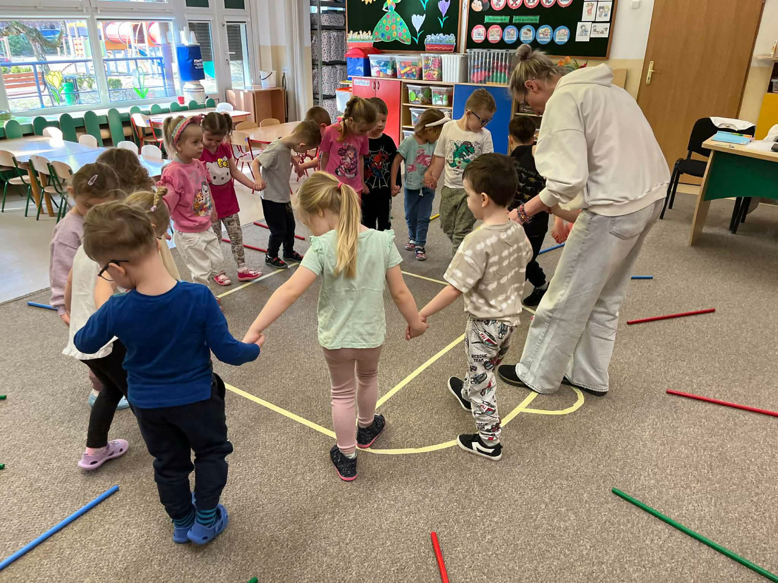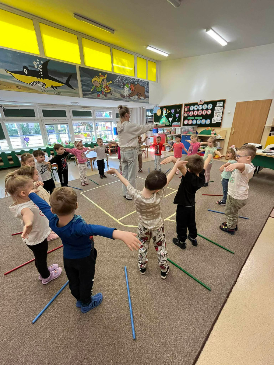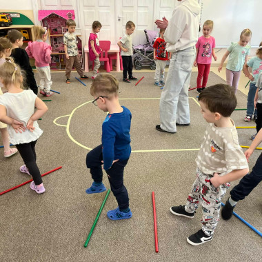 Dzieci w kole przechodzą przez kolorowe kije rozłożone na dywanie