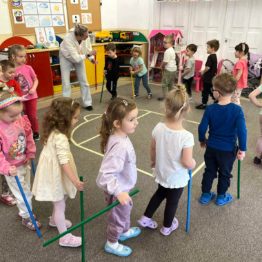 Dzieci unoszą w górę ręce, stoją w kole pomiędzy kijami