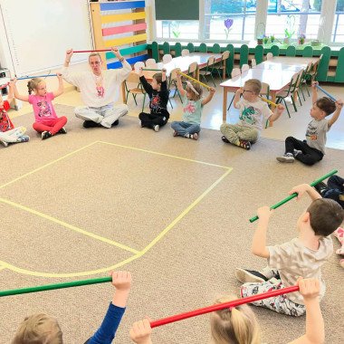 Dzieci siedzą na dywanie w siadzie skrzyżnym i unoszą kolorowe kije nad głową