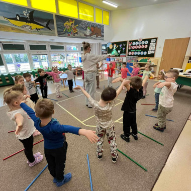 Dzieci maszerują w kole uderzają kolorowym kijem o dywan