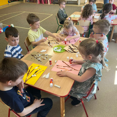 Dzieci przyklejają brakujące elementy do brązowych gałązek