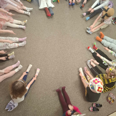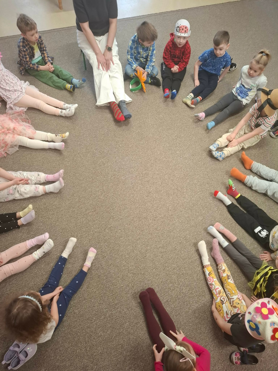 Dzieci siedzą na dywanie i opisują swoje skarpetki