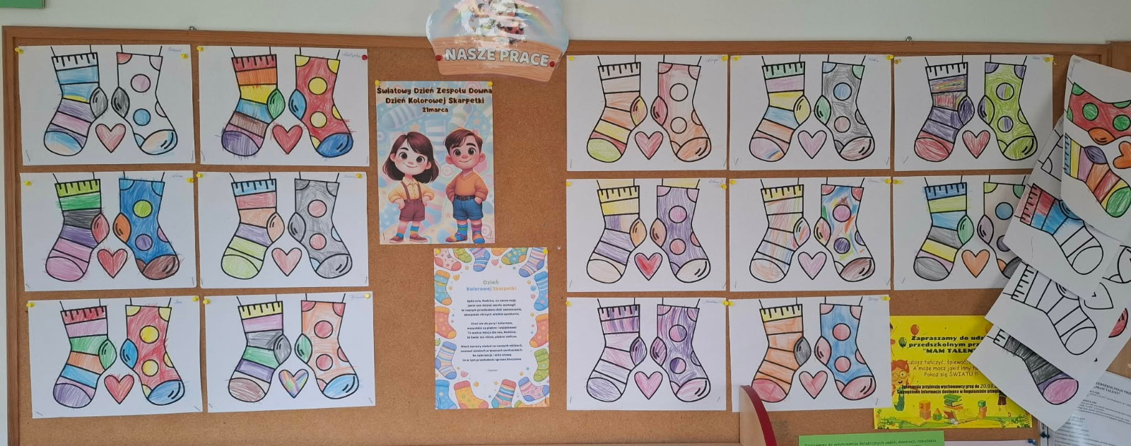 Dzieci wskazują palcem na swoje kolorowe skarpetki