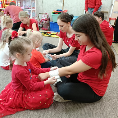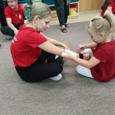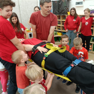 Goście w ciekawy i przystępny sposób pokazali dzieciom, jak udzielać pierwszej pomocy w sytuacjach zagrożenia. Przedszkolaki dowiedziały się, jak prawidłowo wezwać pomoc, ułożyć poszkodowanego w pozycji bocznej oraz jak reagować, gdy ktoś potrzebuje ratunku.