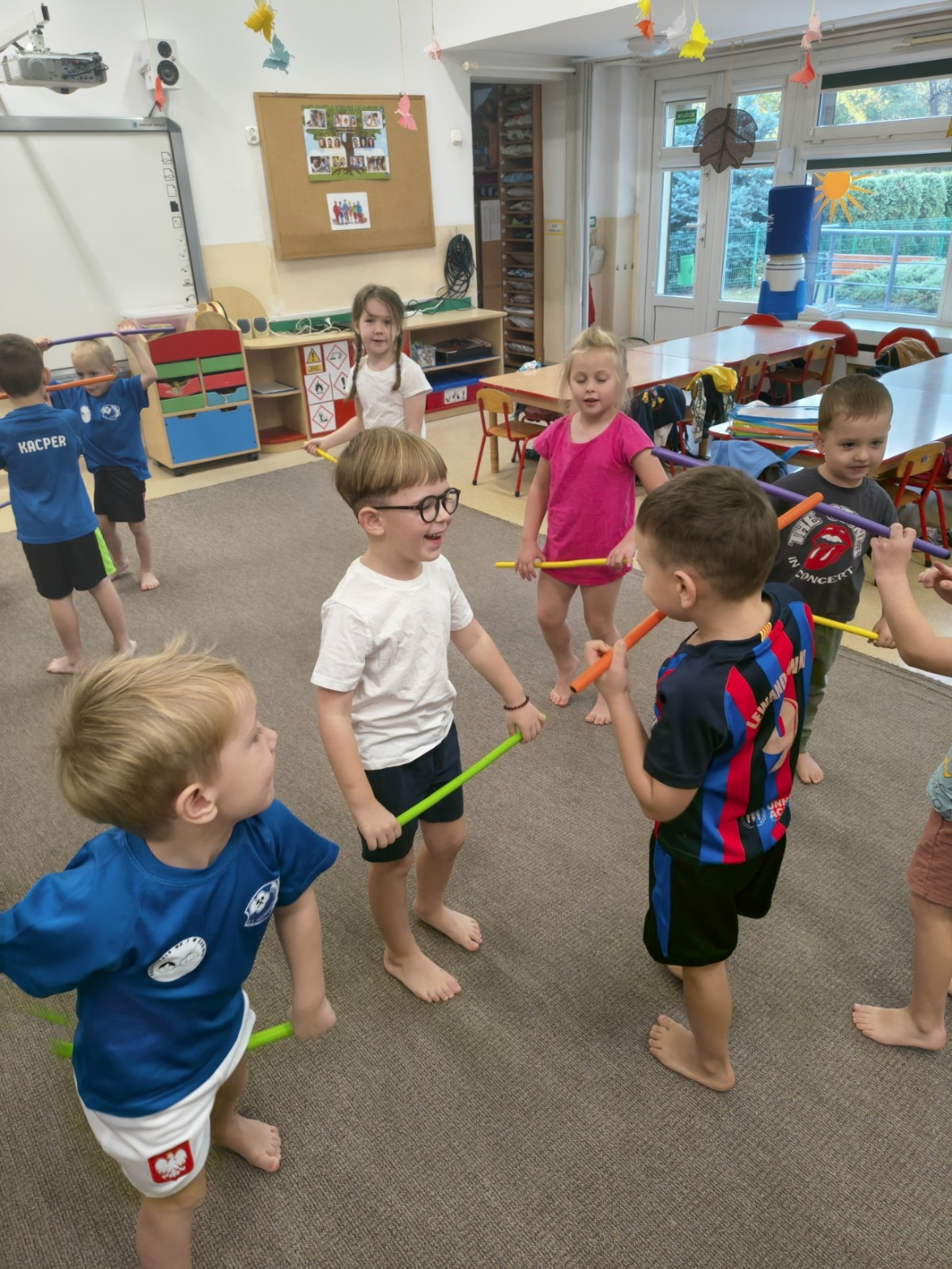 dzieci ćwiczą z pałeczkami