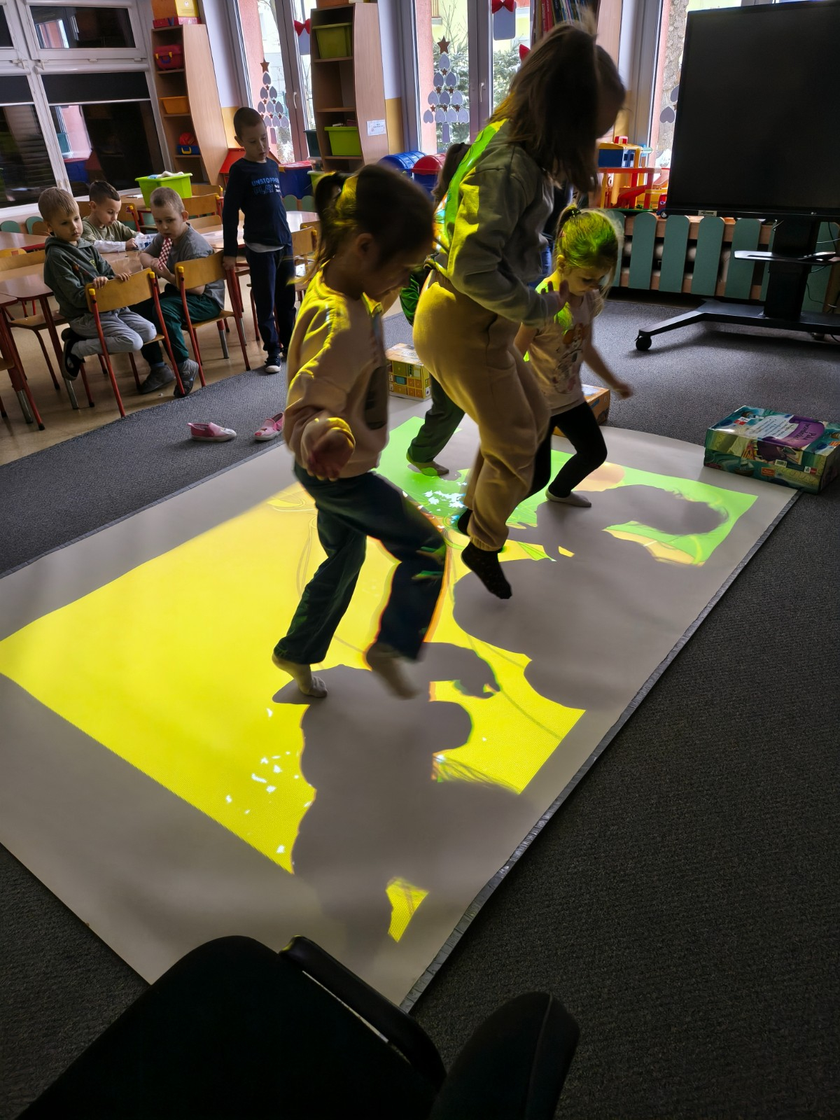 dziewczynki zbijają balony na dywanie interaktywnym