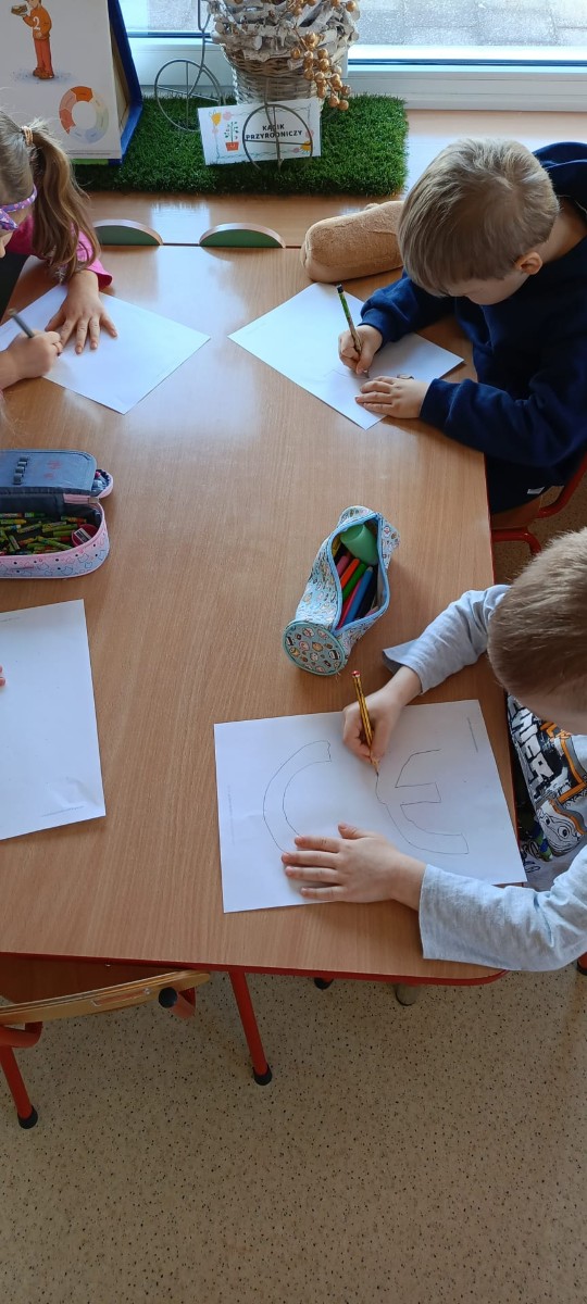 dzieci piszą po śladzie znak ce przy stoliku
