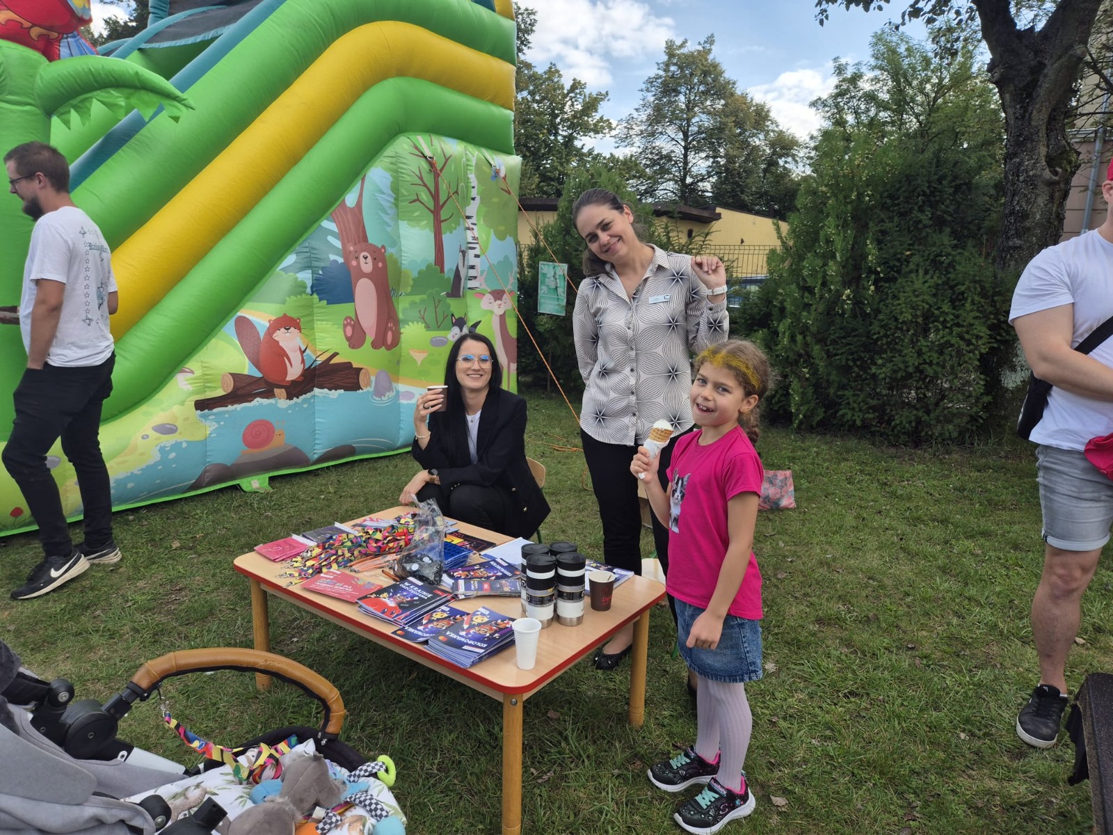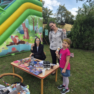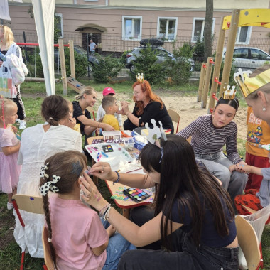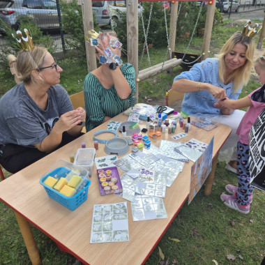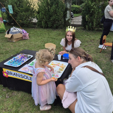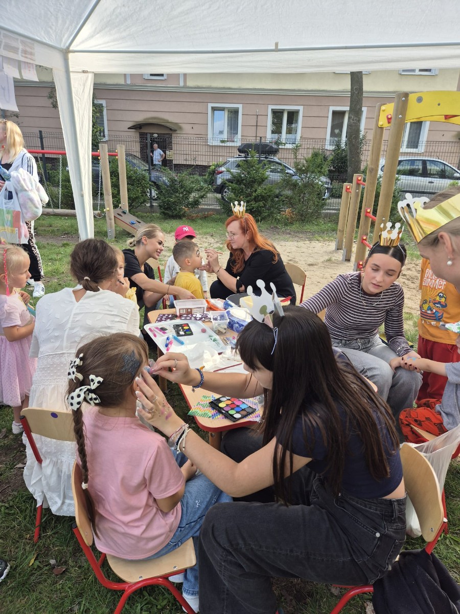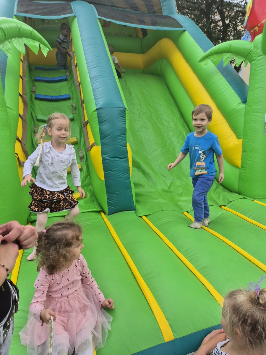Przedszkolny ogród zamienił się w prawdziwe królewskie królestwo pełne barwnych dekoracji, balonów i girland. Na uczestników czekało mnóstwo atrakcji – ogromny dmuchaniec stał się miejscem skoków, ślizgów i radosnych podskoków, a na stanowiskach zorganizowano m.in: malowanie twarzy, brokatowe tatuaże, modelowanie balonów, a także konkurencje sportowe: przeciąganie liny.