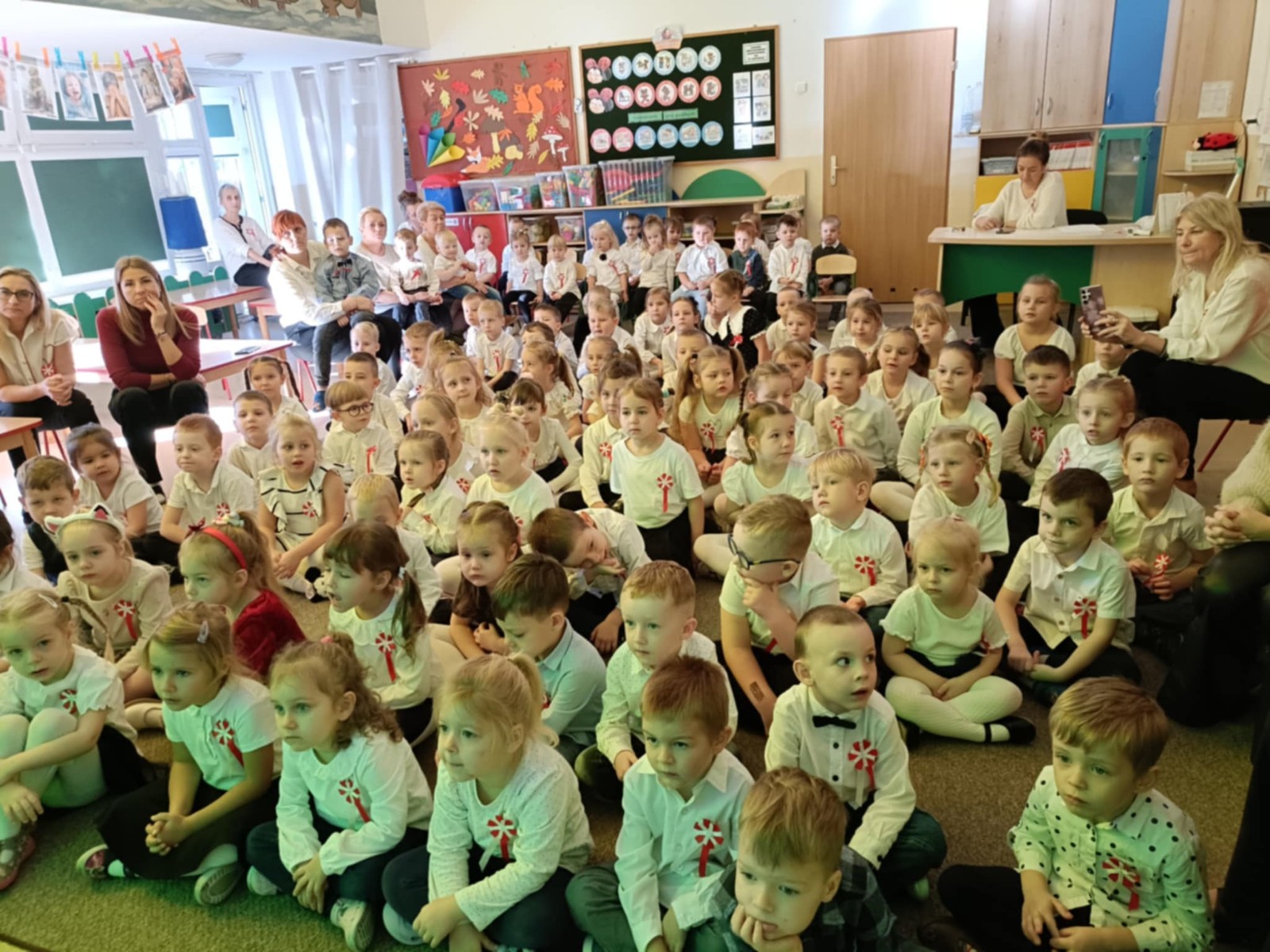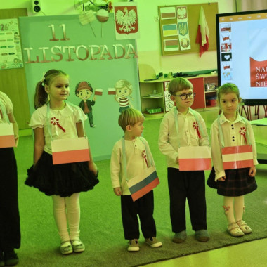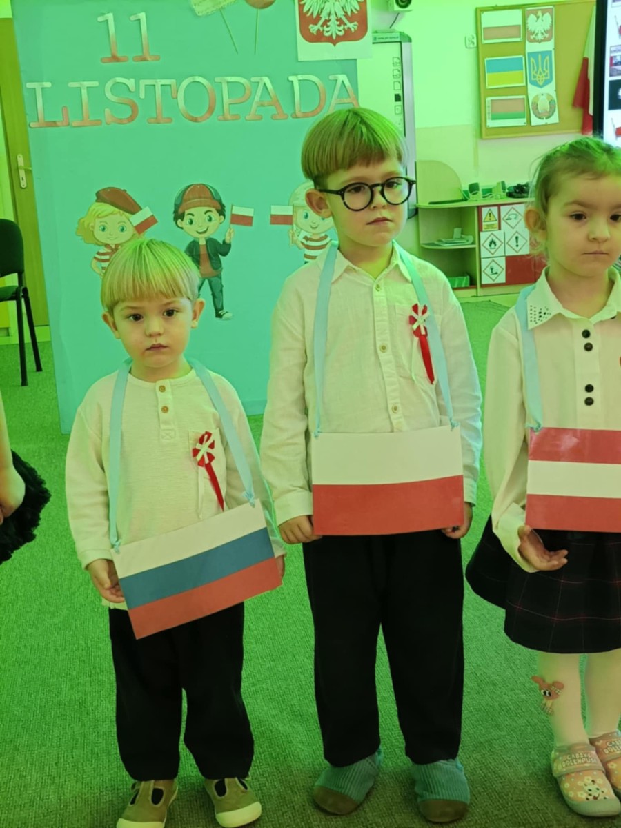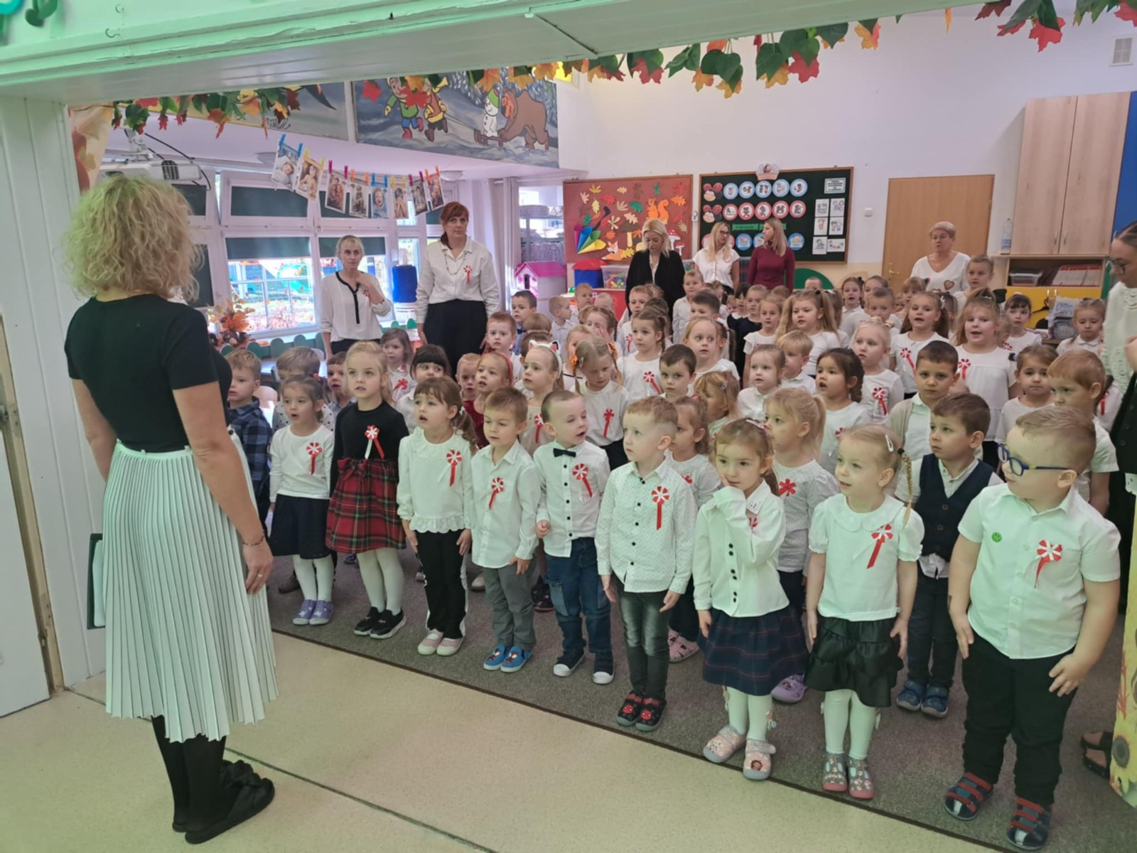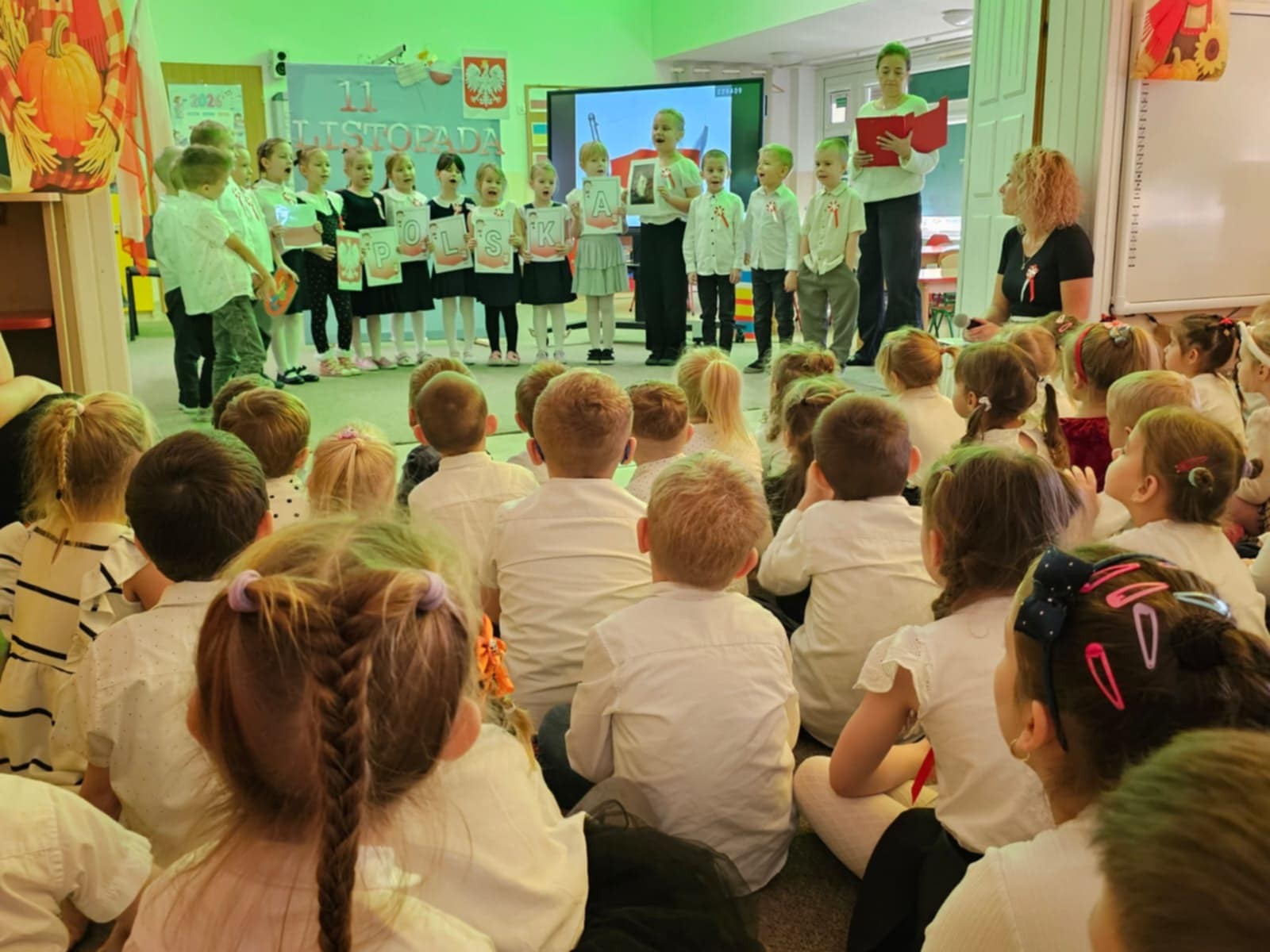 Dnia 07.11.2025r. ubrane na galowo dzieci uroczyście świętowały zbliżające się obchody Dnia Niepodległości poprzez wiersze i piosenki na temat naszego kraju i jego symboli narodowych. W tematykę święta wprowadził dzieci film edukacyjny „11 Listopada”, który przedszkolaki obejrzały z dużym zainteresowaniem. Wszyscy z powagą i w dużym skupieniu podziwiali program artystyczny przygotowany przez dzieci z grupy IV „Żabki”, a także Julkę z najmłodszej grupy przedszkolnej. O godzinie 11.11 przedszkolaki uroczyście odśpiewały Hymn Polski, a następnie obejrzały biało - czerwoną wystawę prac, wyeksponowaną na korytarzu przedszkola. Za udział w uroczystości dzieci otrzymały pamiątkowe dyplomy i patriotyczne kolorowanki.
