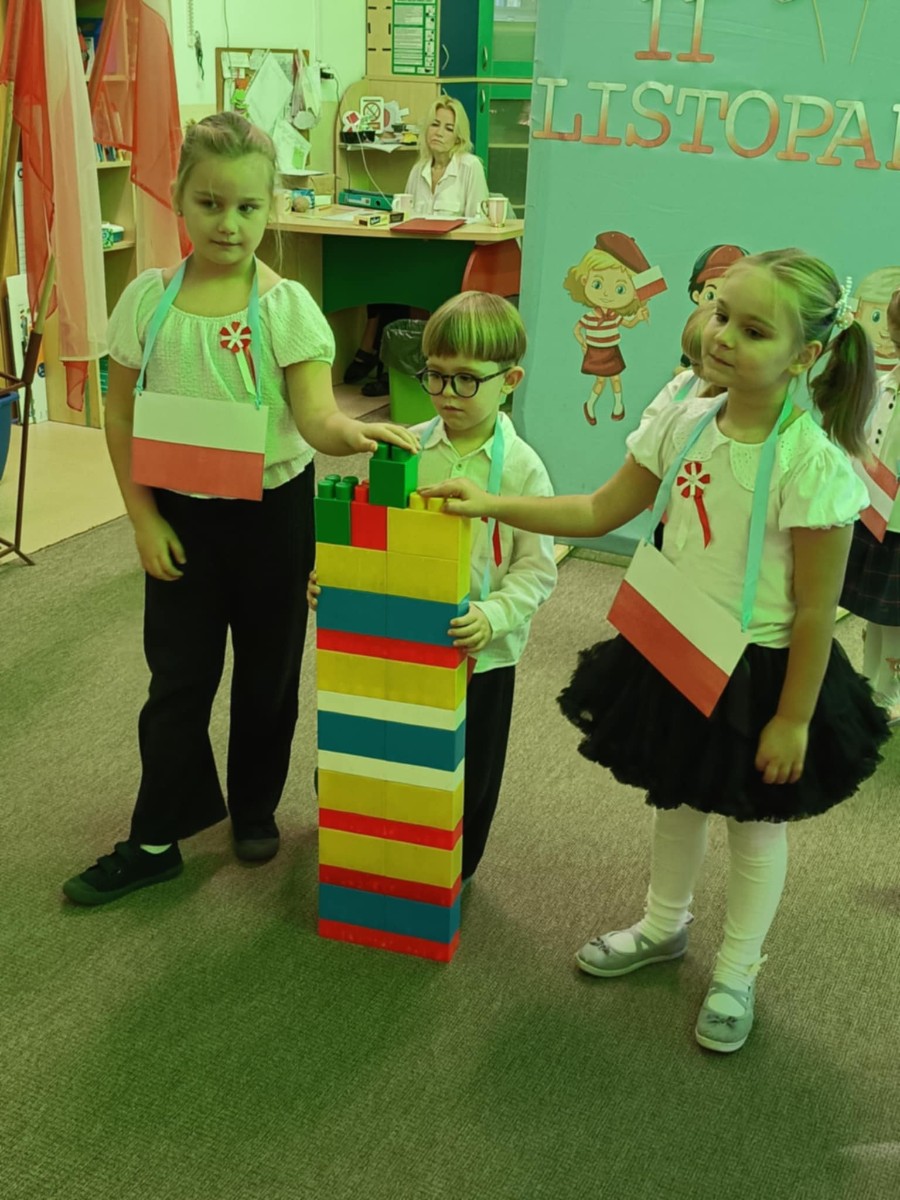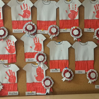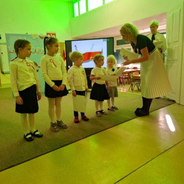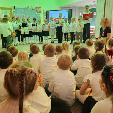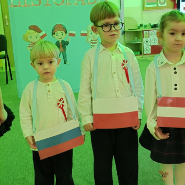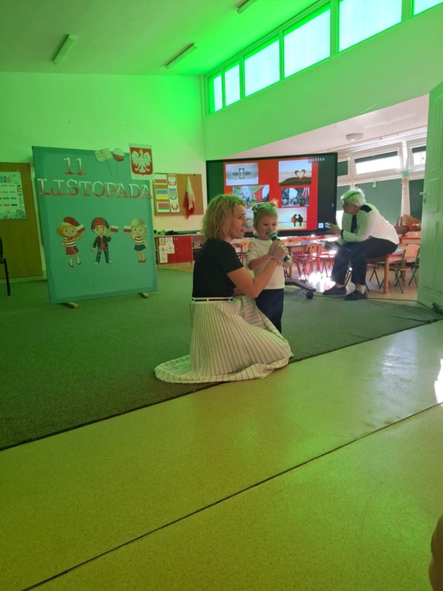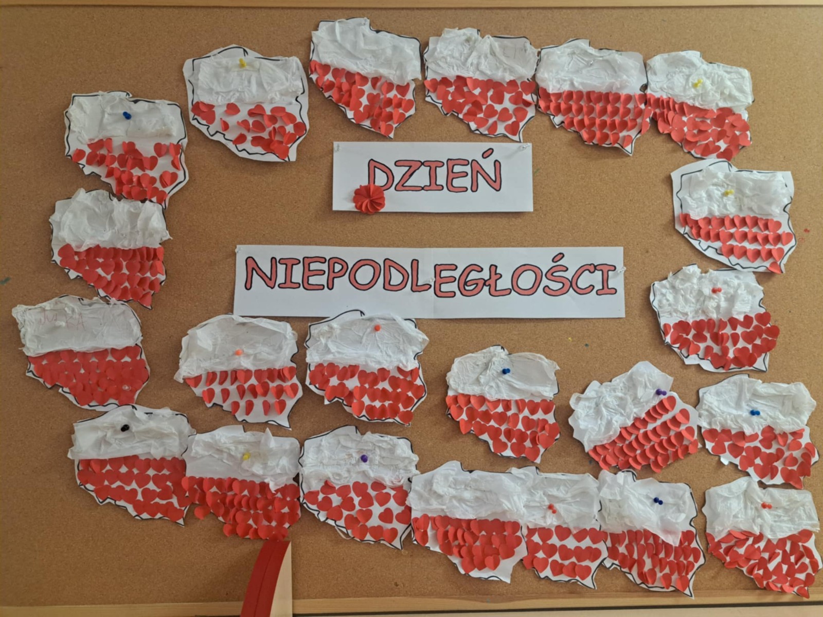 Dnia 07.11.2025r. ubrane na galowo dzieci uroczyście świętowały zbliżające się obchody Dnia Niepodległości poprzez wiersze i piosenki na temat naszego kraju i jego symboli narodowych. W tematykę święta wprowadził dzieci film edukacyjny „11 Listopada”, który przedszkolaki obejrzały z dużym zainteresowaniem. Wszyscy z powagą i w dużym skupieniu podziwiali program artystyczny przygotowany przez dzieci z grupy IV „Żabki”, a także Julkę z najmłodszej grupy przedszkolnej. O godzinie 11.11 przedszkolaki uroczyście odśpiewały Hymn Polski, a następnie obejrzały biało - czerwoną wystawę prac, wyeksponowaną na korytarzu przedszkola. Za udział w uroczystości dzieci otrzymały pamiątkowe dyplomy i patriotyczne kolorowanki.