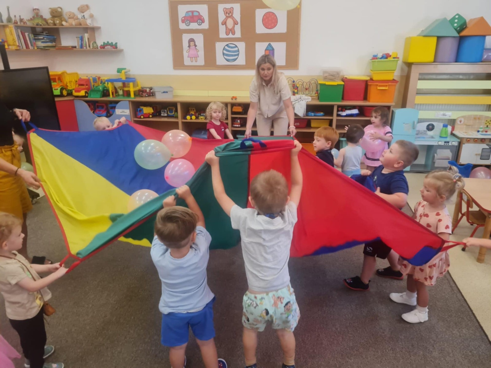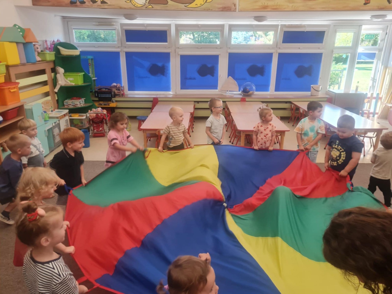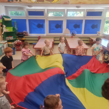 dzieci bawią się chustą animacyjną