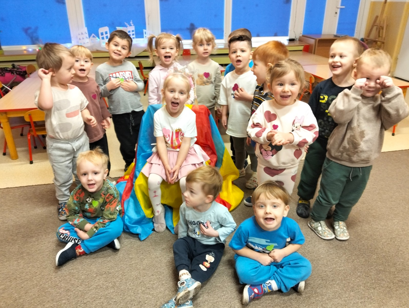 Dziewczynka siedzi na krześle, dzieci biją brawo