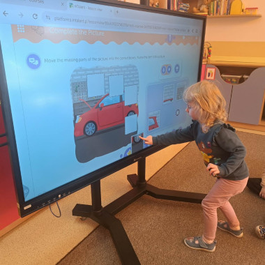 dziewczynka układa puzzle na tablicy interaktywnej