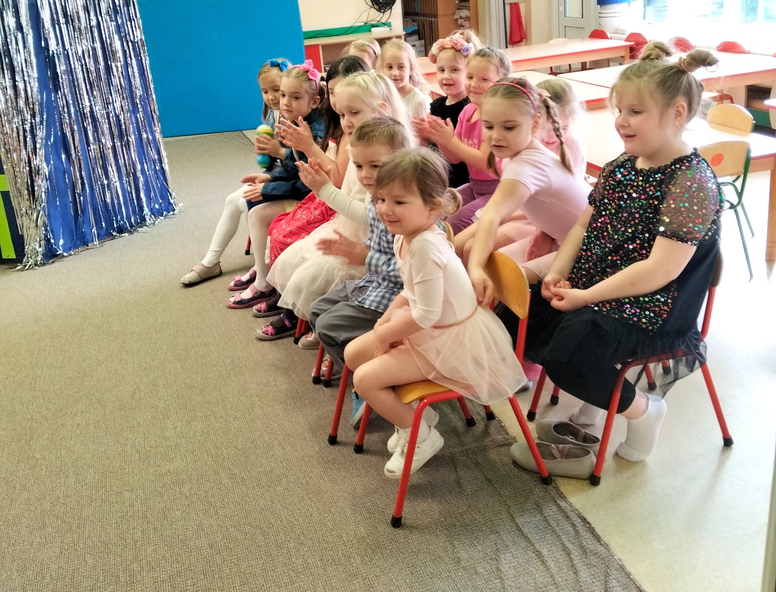 Dzieci siedzą na krzesełkach w oczekiwaniu na swój występ