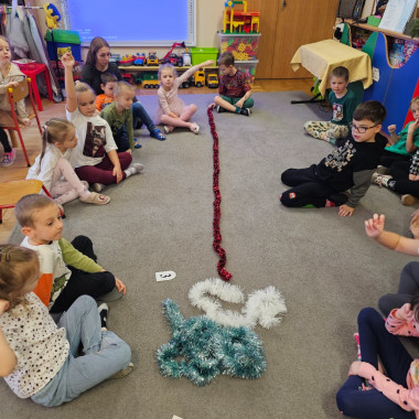 Chłopiec rozkłada czerwony łańcuch choinkowy
