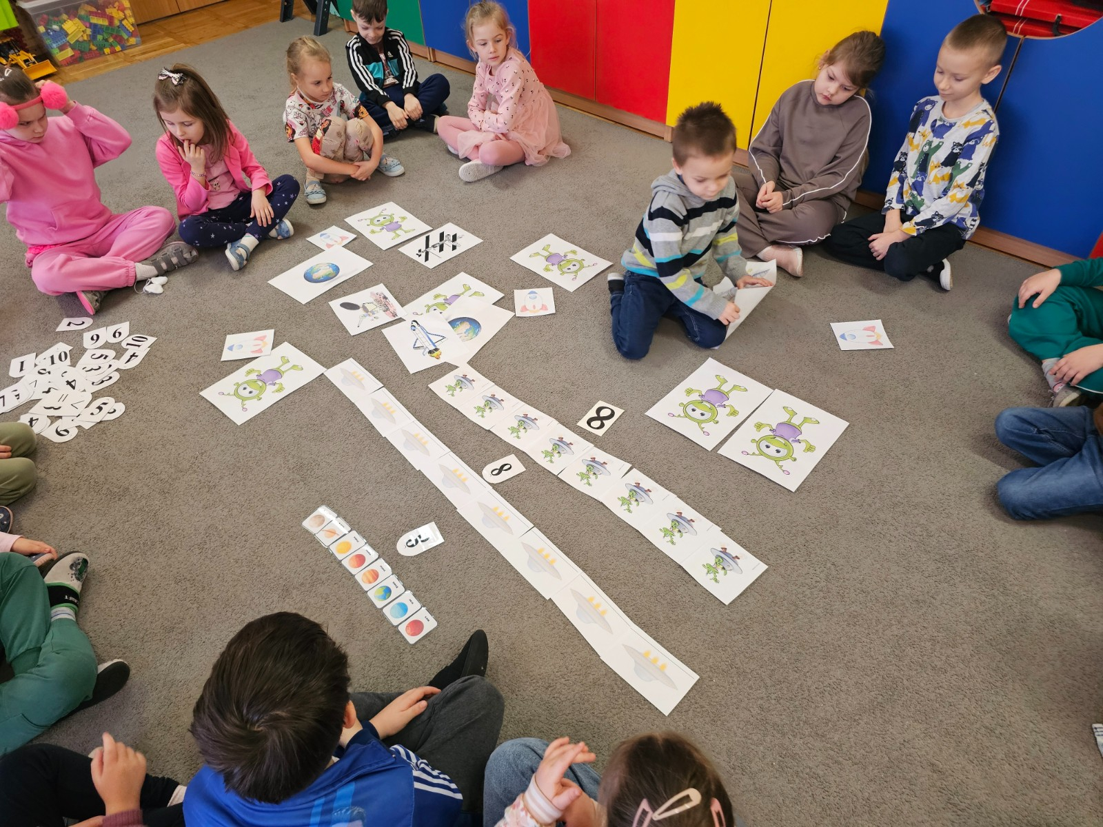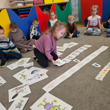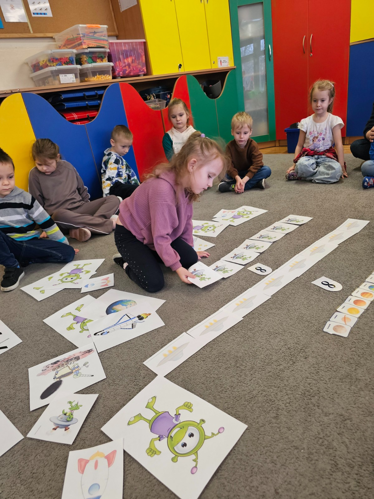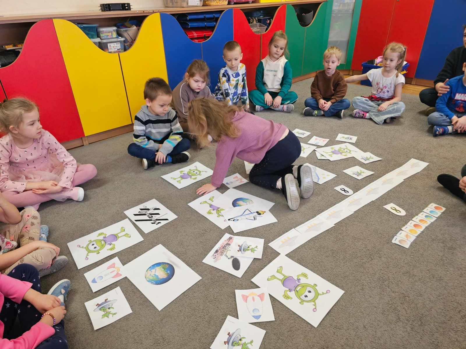 Dzieci na dywanie wokół obrazków