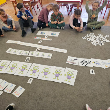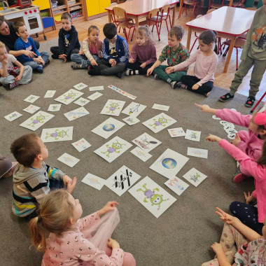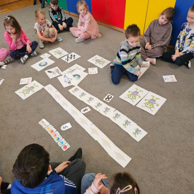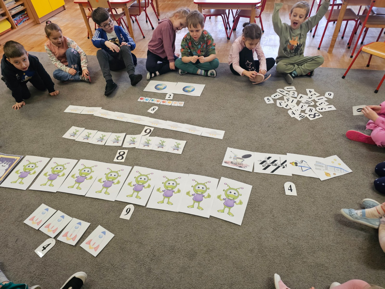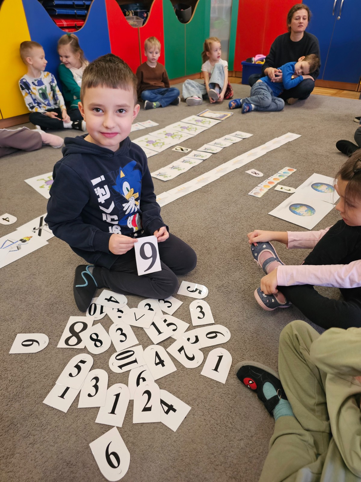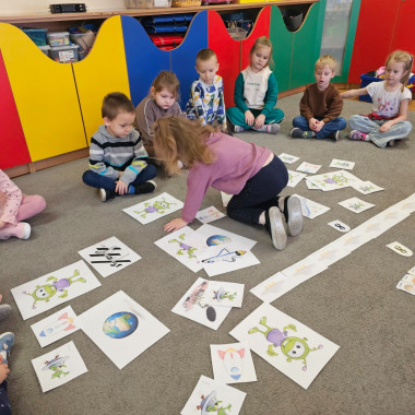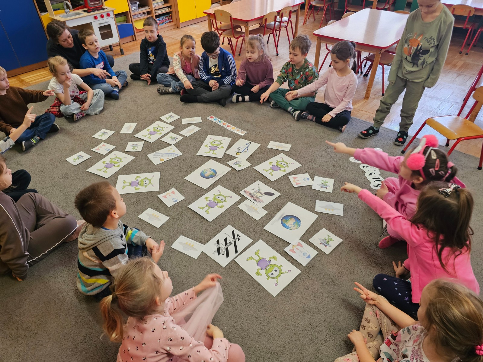 Dzieci na dywanie wokół obrazków