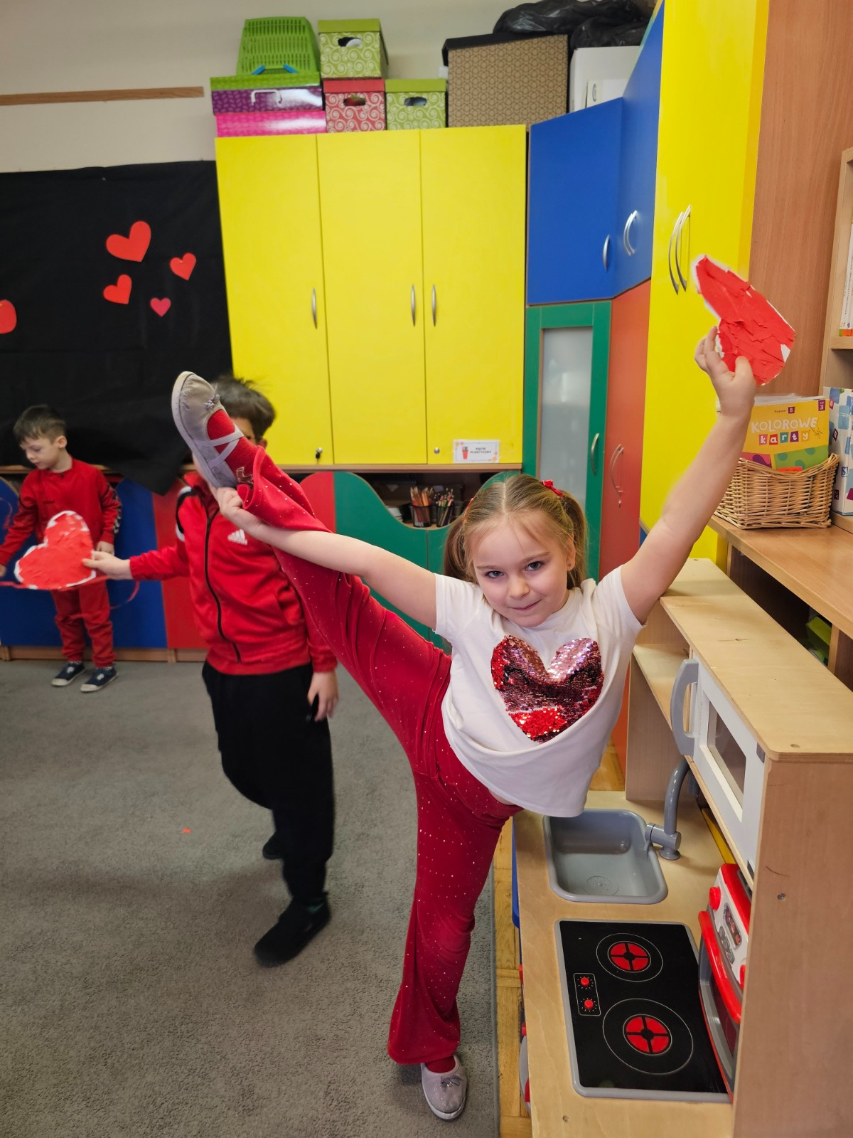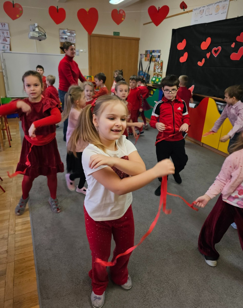 Taniec dzieci z papierowymi serduszkami