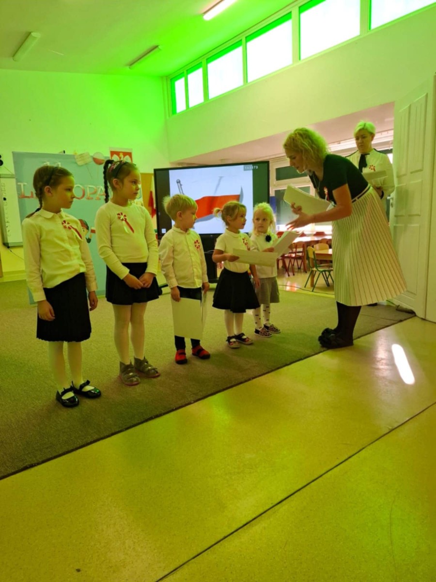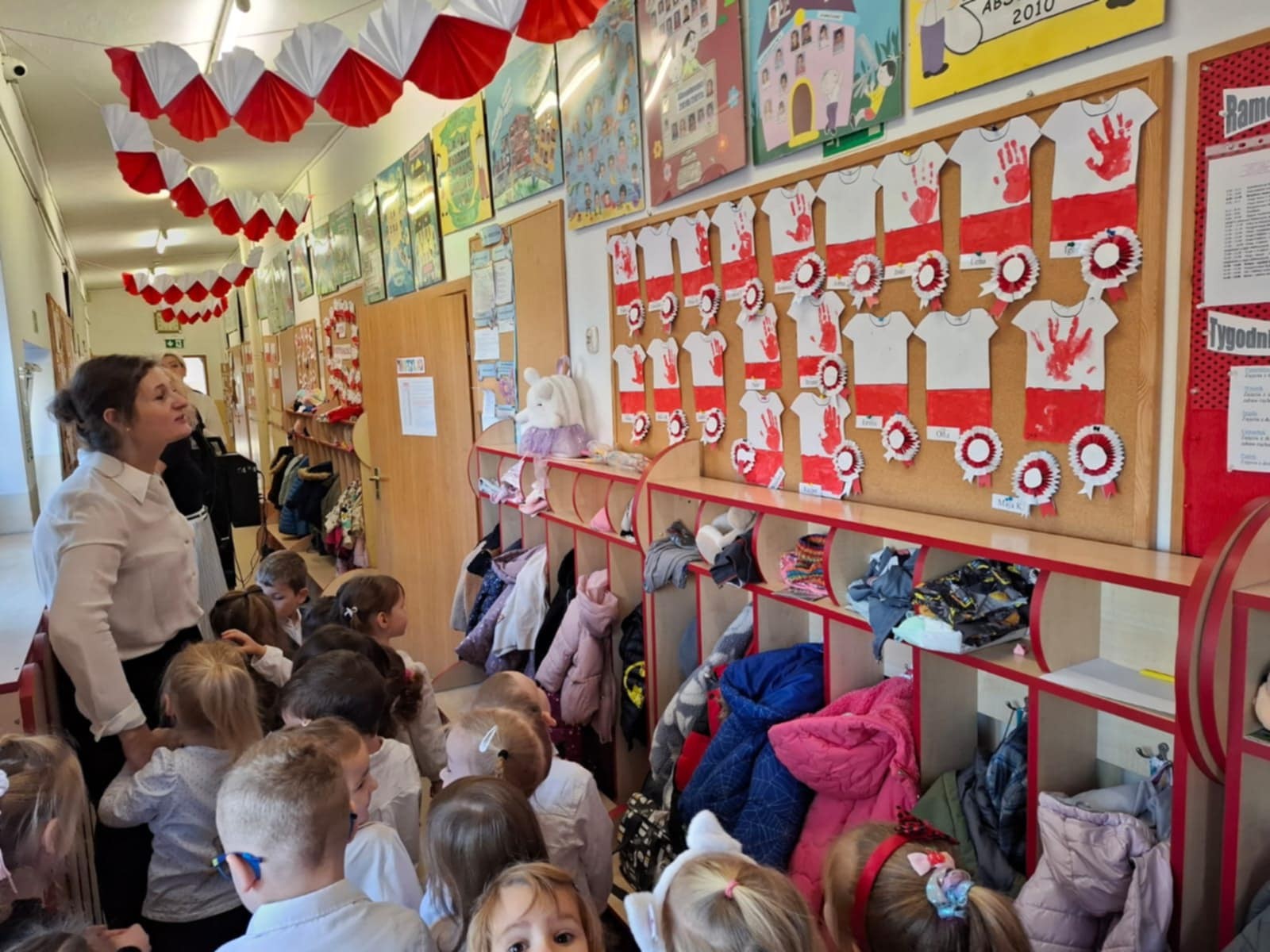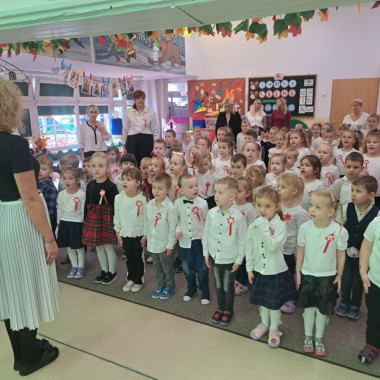 Dnia 07.11.2025r. ubrane na galowo dzieci uroczyście świętowały zbliżające się obchody Dnia Niepodległości poprzez wiersze i piosenki na temat naszego kraju i jego symboli narodowych. W tematykę święta wprowadził dzieci film edukacyjny „11 Listopada”, który przedszkolaki obejrzały z dużym zainteresowaniem. Wszyscy z powagą i w dużym skupieniu podziwiali program artystyczny przygotowany przez dzieci z grupy IV „Żabki”, a także Julkę z najmłodszej grupy przedszkolnej. O godzinie 11.11 przedszkolaki uroczyście odśpiewały Hymn Polski, a następnie obejrzały biało - czerwoną wystawę prac, wyeksponowaną na korytarzu przedszkola. Za udział w uroczystości dzieci otrzymały pamiątkowe dyplomy i patriotyczne kolorowanki.